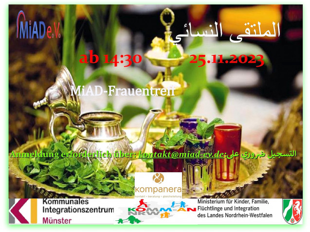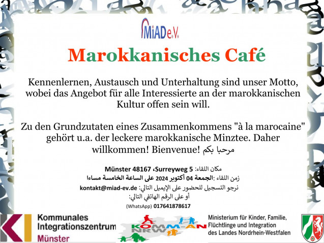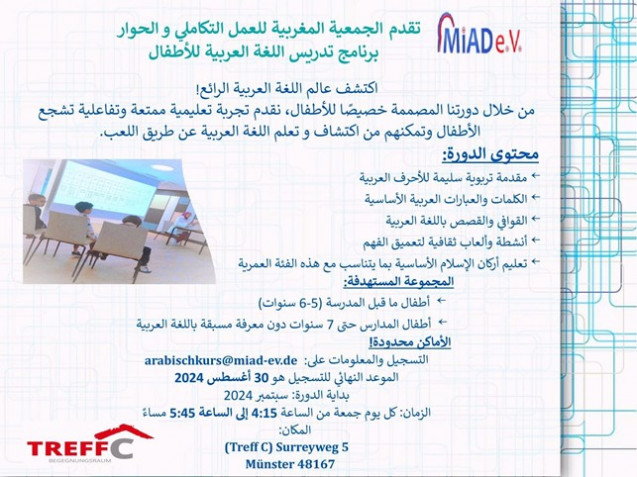 Allأنشطة إجتماعیةأنشطة ثقافیةأنشطة ریاضیةدلیل الوافدین الجدد 07.12.2025الحفل الصيفي السنوي04.10.2025مباريات كرة القدماكتشف عالم اللغة العربية المدهش!04.10.2024الملتقى النسائي31.08.2024موسم جديد – حصص رياضية للنساءاكتشف عالم اللغة العربية الرائع!Schloss الحفل الصيفي السنوي لممثلية الطلبة الأجانب بمونستر أمام22.06.2024حصص رياضية للنساءالملتقى النسائي25.11.2023الملتقى النسائي28.10.202319.11.2022الملتقى النسائي25.11.2023ملتقى “التقشاب”- دعوة عامة01.09.2023الحفل الصيفي الجميل لممثلية الطلبة الأجانب بمونستر أمام Schloss12.06.2023ملتقى “التقشاب” النسائي الثالث01-05-2023اليوم العالمي للغة الأم26.02.2023ملتقى “التقشاب” النسائي الثاني03.12.2022ملتقى “التقشاب” الثاني13.11.2022لقاء ألعاب للأطفال في NINFLY مونستر18-12-2021حفلة عيد الأضحى17.07.2022دعوة لزيارة الخيمة المغربية ضمن فعاليات مهرجان إفريقيا19.08.2023مسابقة التوقعات10-12-2022تهنئة الجماهير المغربية و العربية بالفوز على البرتغال والدعوة لمتابعة مباراة نصف النهاية ضد فرنسا14 - 12 - 2022دعوة لمتابعة مباراة المغرب ضد كرواتيا17.12.2022إفتتاح لقاءات التنس08.05.2023صور من اللقاءات الكرویةانطباعات من ورشة العمل التفاعلیة حول العنصریة27.08.2021الجمع العام السنوي یوم 19 یولیوز 202019.07.2020من المحاضرة القیمة “كیفیة توجیه أبنائنا و توجهات المستقبل”27.12.2019دورة تدریبیة في مجال الصحافة و الإعلام الإخباري13.12.2019الجمعية المغربية للعمل التكاملي و الحوار بالتعاون مع ALMANIYYA UG14/15.12.2019تدعو الجمعیة المغربیة للعمل التكاملي و الحوار إلى دورة تدریبیة تحت عنوان Bitte auf Deutsch!29.11.2019فریق الجمعیة الریاضي في المیدانمسابقة نكهات العالم2019مهرجان الثقافات 20192019الحفل الصیفي لممثلیة الطلبة الأجانب 2019Samstag 22. Juni 2019دلیل الوافدین الجددالیوغا للنساءحملة تبرعات: من أجل إبتسامة دافئة 2018الحفل الصیفي لجمعیتنا 20182017.07.01 یومملتقى الشباب الأول12.10.2018أمسیة ثقافیة عن المغربFreitag, 16. November 2018 um 18:30لقاء النساءكرة القدم للرجالعید الفطر بطریقة أخرىیوم الأحد 09/07/2017الحفل الصیفي لممثلیة الطلبة الأجانب 2017Samstag 01. Juli 2017مهرجان الثقافاتالسبت30 سبتمبر2017 بمونستر