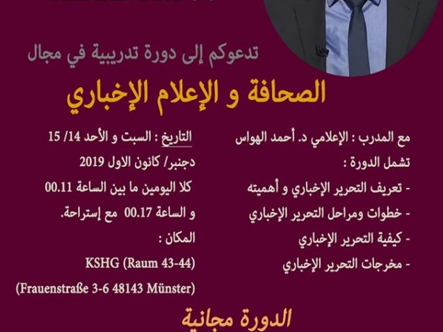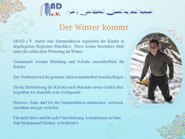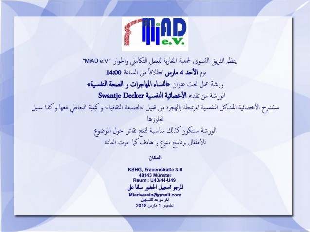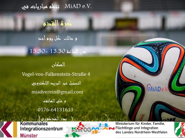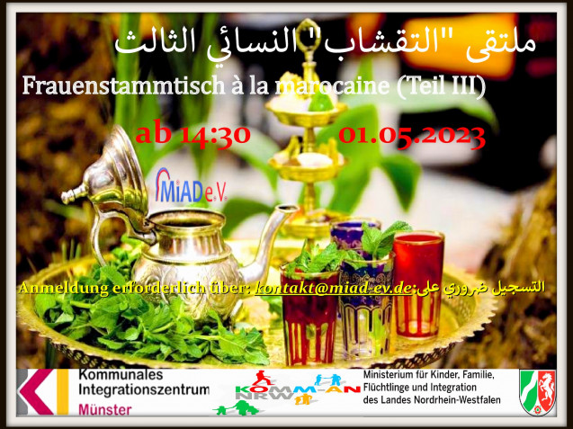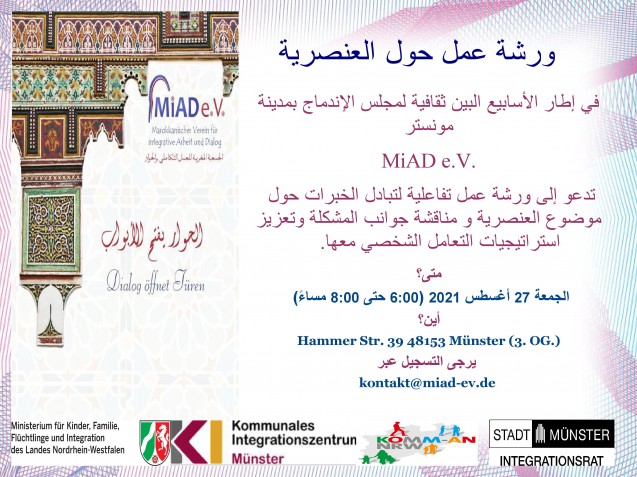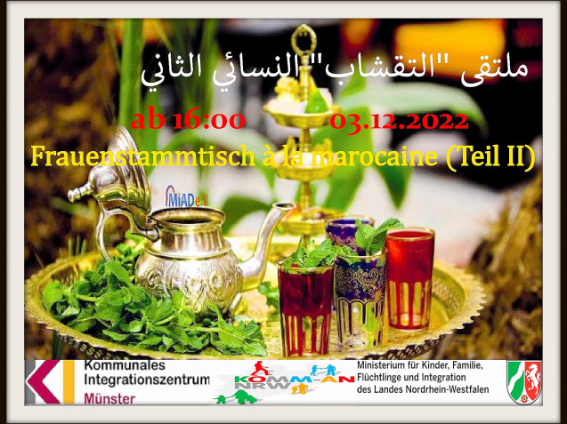 Allأنشطة إجتماعیةأنشطة ثقافیةأنشطة ریاضیةدلیل الوافدین الجدد 19.11.2022الملتقى النسائي25.11.2023ملتقى “التقشاب”- دعوة عامة01.09.2023الحفل الصيفي الجميل لممثلية الطلبة الأجانب بمونستر أمام Schloss12.06.2023ملتقى “التقشاب” النسائي الثالث01-05-2023اليوم العالمي للغة الأم26.02.2023ملتقى “التقشاب” النسائي الثاني03.12.2022ملتقى “التقشاب” الثاني13.11.2022لقاء ألعاب للأطفال في NINFLY مونستر18-12-2021حفلة عيد الأضحى17.07.2022دعوة لزيارة الخيمة المغربية ضمن فعاليات مهرجان إفريقيا19.08.2023مسابقة التوقعات10-12-2022تهنئة الجماهير المغربية و العربية بالفوز على البرتغال والدعوة لمتابعة مباراة نصف النهاية ضد فرنسا14 - 12 - 2022دعوة لمتابعة مباراة المغرب ضد كرواتيا17.12.2022إفتتاح لقاءات التنس08.05.2023صور من اللقاءات الكرویةانطباعات من ورشة العمل التفاعلیة حول العنصریة27.08.2021الجمع العام السنوي یوم 19 یولیوز 202019.07.2020من المحاضرة القیمة “كیفیة توجیه أبنائنا و توجهات المستقبل”27.12.2019دورة تدریبیة في مجال الصحافة و الإعلام الإخباري13.12.2019الجمعية المغربية للعمل التكاملي و الحوار بالتعاون مع ALMANIYYA UG14/15.12.2019تدعو الجمعیة المغربیة للعمل التكاملي و الحوار إلى دورة تدریبیة تحت عنوان Bitte auf Deutsch!29.11.2019فریق الجمعیة الریاضي في المیدانمسابقة نكهات العالم2019مهرجان الثقافات 20192019الحفل الصیفي لممثلیة الطلبة الأجانب 2019Samstag 22. Juni 2019دلیل الوافدین الجددالیوغا للنساءحملة تبرعات: من أجل إبتسامة دافئة 2018الحفل الصیفي لجمعیتنا 20182017.07.01 یومملتقى الشباب الأول12.10.2018أمسیة ثقافیة عن المغربFreitag, 16. November 2018 um 18:30لقاء النساءكرة القدم للرجالعید الفطر بطریقة أخرىیوم الأحد 09/07/2017الحفل الصیفي لممثلیة الطلبة الأجانب 2017Samstag 01. Juli 2017مهرجان الثقافاتالسبت30 سبتمبر2017 بمونسترفن الخط العربي21.00 إلى 18.00 من، 2017.12.07 ،الخمیس