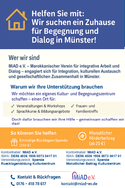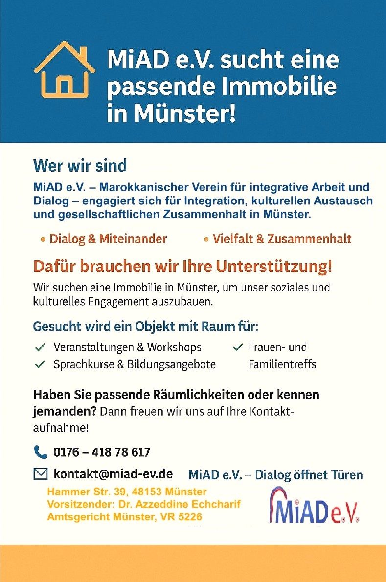ومن أجل مواصلة أنشطتنا المتنوعة بشكل مستدام، فإننا نبحث عن عقار مناسب في مدينة مونستر. ولا يُفترض أن يكون هذا العقار مقراً للجمعية فحسب، بل مساحة تخدم الأغراض التالية