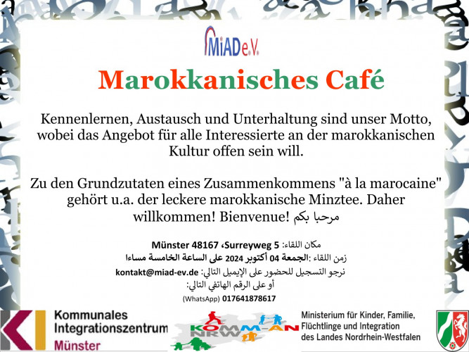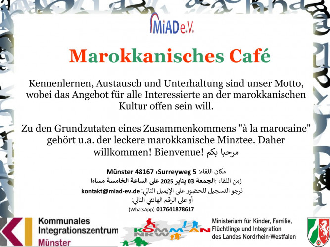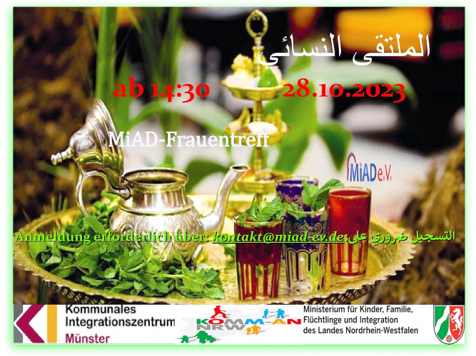 07.12.2025Marokkanisches CaféMarokkanisches Café04.10.2024MiAD-Frauentreff31.08.2024MiAD-Frauentreff25.11.2023MiAD-Frauentreff28.10.2023BEWEGUNGSPIELE FÜR KINDER18-12-2021Interkulturelle Operfestsfeier17.07.2022Heimatpreis08.12.2019Workshop über Rassismus27.08.2021Eindrücke aus der Mitgliederversammlung von MiAD e.V.19.07.2020Vortrag mit dem Thema “Herausforderungen des Umgangs mit den zeitgenössischen Medien”14/15.12.2019 Posts navigation 1 2 Nächster 12/17